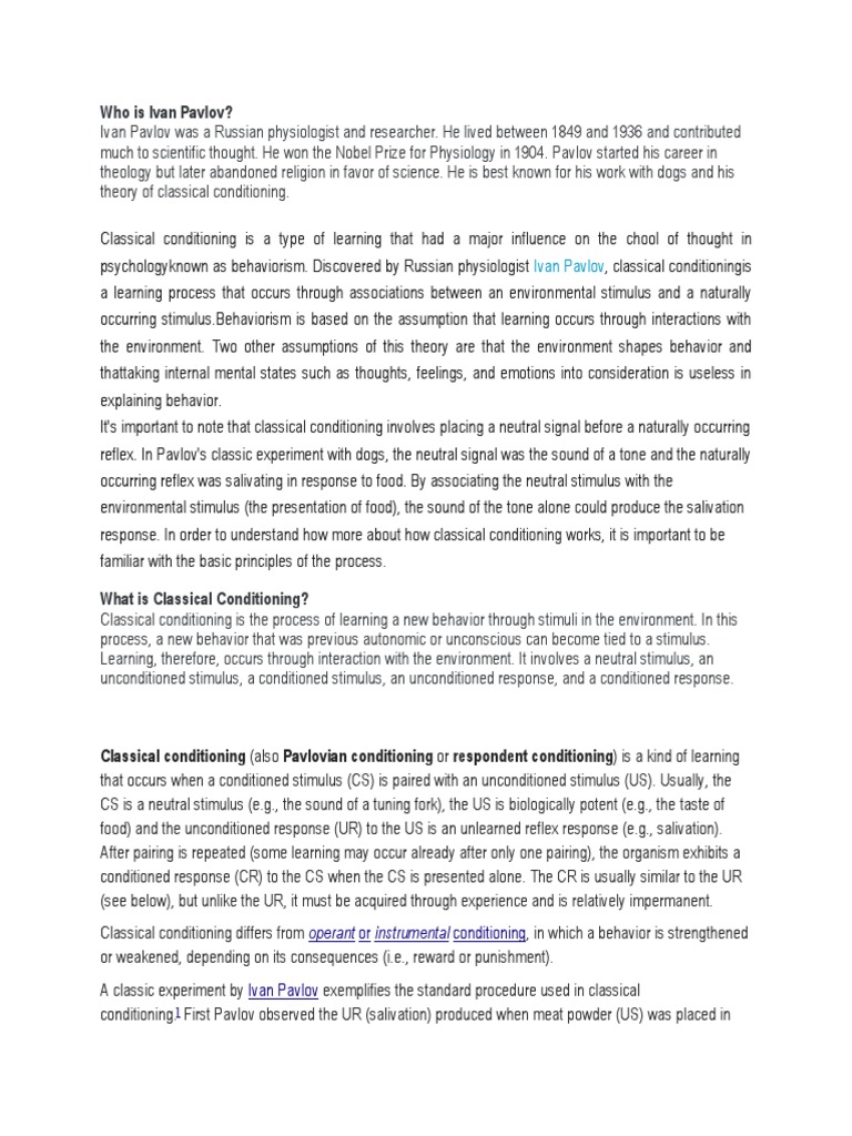 The classical conditioning is a theory by Ivan Pavlov describing the learning achievements caused by the association between stimuli of the environment and automatic reactions in the body. Following the studies of Pavlov, John Watson came to an idea that all complex behaviors were strings of conditioned behavior and learning through classical conditioning would cause many phobias. The Pavlov classical conditioning essay has five variables:. Classical conditioning occurs when a neutral stimulus is associated with an unconditioned stimulus. The unconditioned stimulus automatically triggers a certain response: unconditioned response. Then, in a regular and frequent manner, when a neutral stimulus is in the presence of unconditioned stimulus, classical conditioning essay, usually an unconscious association is created between the two stimuli.