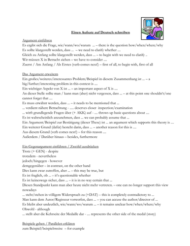 The first step to a great essay is to have a clear structure essays in german language it comes to text. There should be an introduction sentence with the name of your hometown, which country or state it belongs to, whether it is big or small and maybe whether you like it or not. Then you can write about the city center, parks, the different parts of the town or anything special that comes to mind, such as famous people who grew up there or historic events. In the final part, you can describe your own neighborhood and what you like or dislike about it. The two examples below provide good examples of what essays in german language German essay should look like in the end. To give you even more assistance, I added some key vocabulary which should save you some time during your homework.